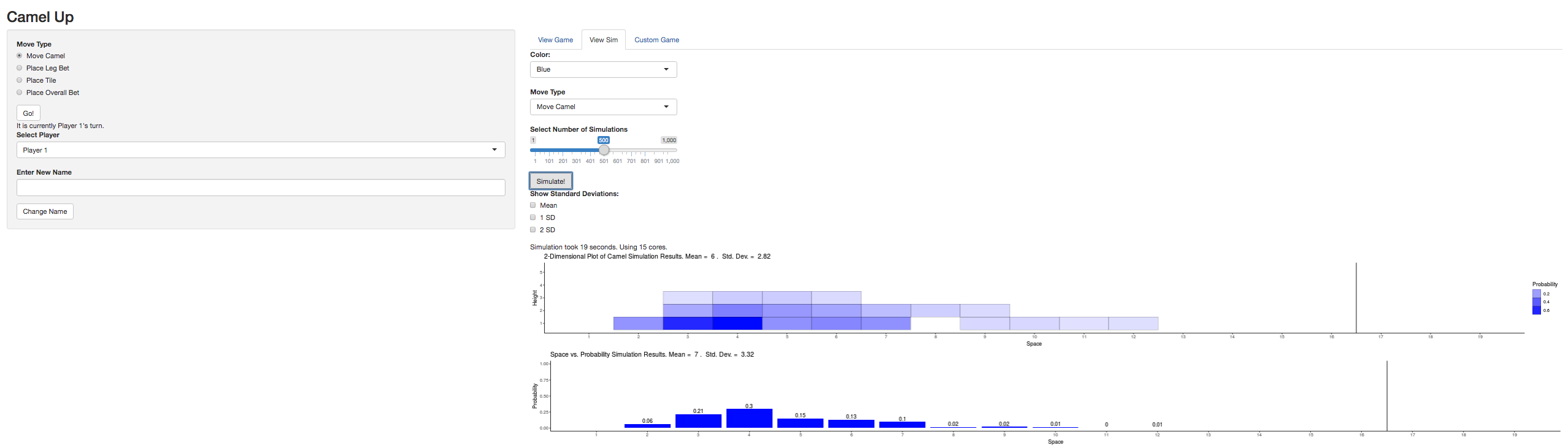 The goal of camelUp is to implement the board game CamelUp and include simulations to assist instruction in introductory statistics courses.