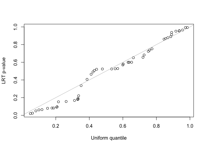 qqplot(runif(length(pLRT)), pLRT, xlab = "Uniform quantile", ylab = "LRT p-value")