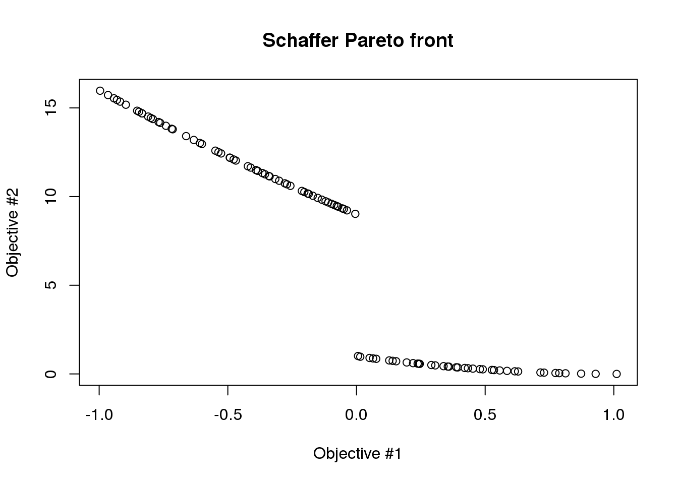 {r schaffer_plot1} plot(results$objectives[,1], results$objectives[,2], main="Schaffer Pareto front", xlab="Objective #1", ylab="Objective #2")