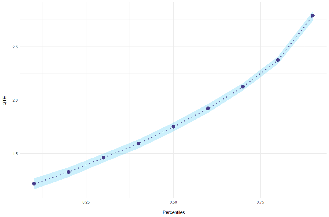 The input gvar denotes the period in which this individual receives the treatment. mod contains for every bootstrap run the point-estimates. The function summary then combines all bootstrap runs to a quantile treatment effect and adds standard errors: