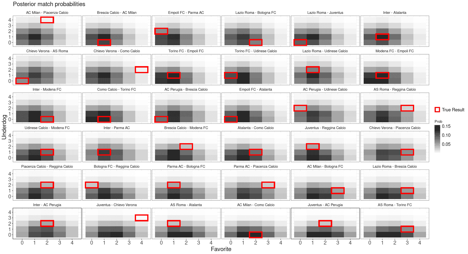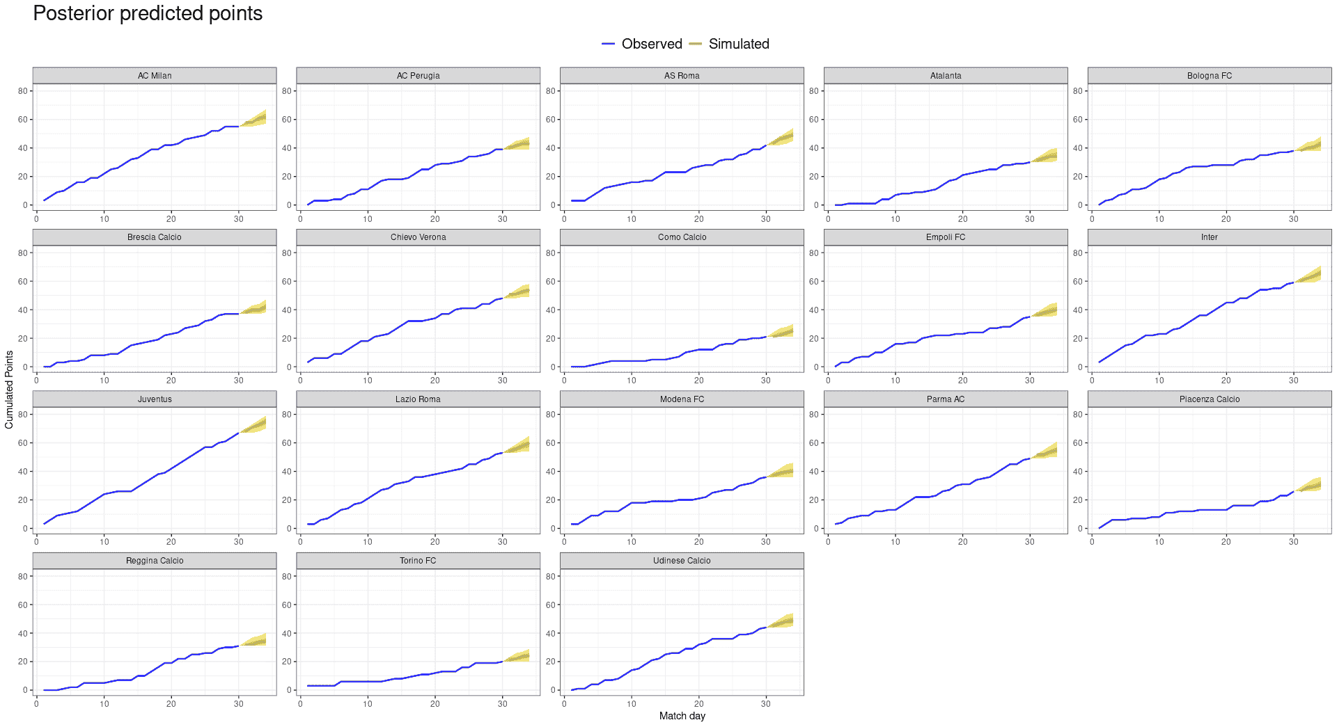In what follows, a quick example to fit a Bayesian double Poisson model for the Italian Serie A (seasons 2000-2001, 2001-2002, 2002-2003), visualize the estimated teams’ abilities, and predict the last four match days for the season 2002-2003: