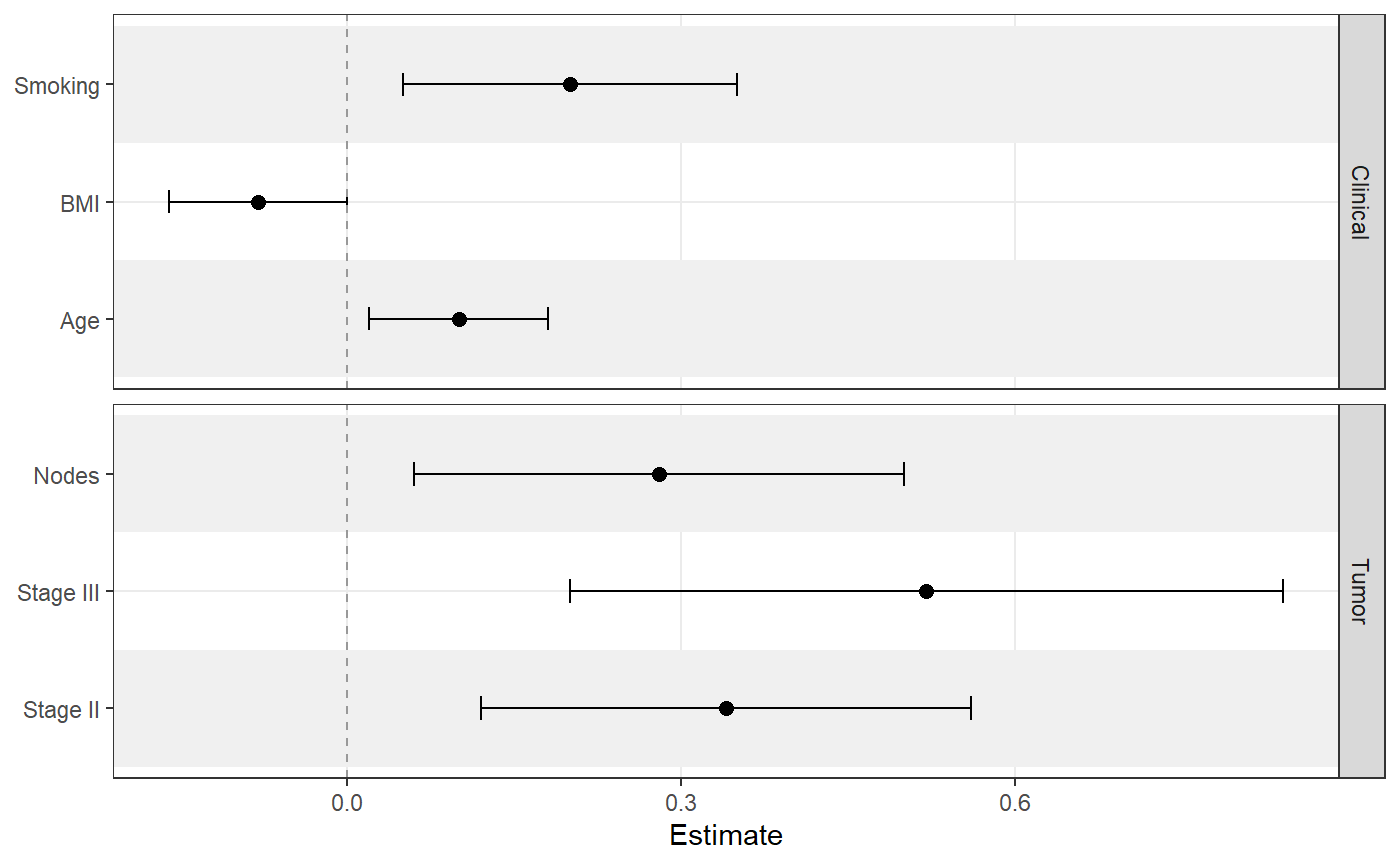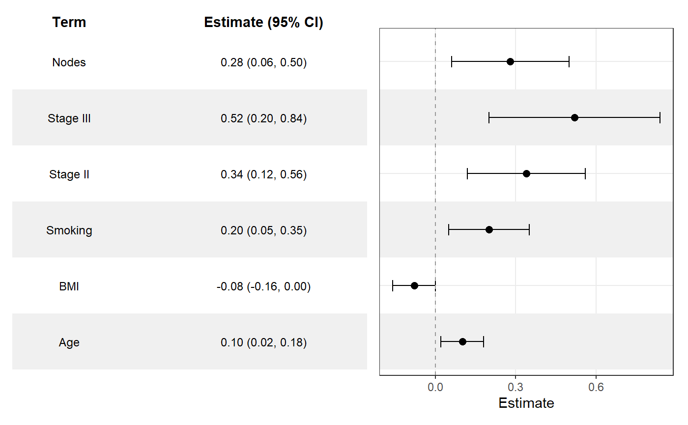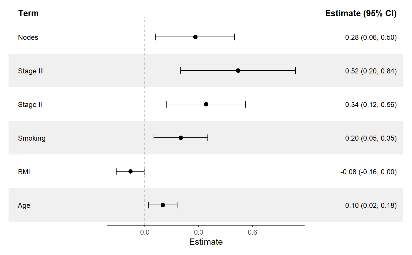 term = c("Age", "BMI", "Smoking", "Stage II", "Stage III", "Nodes"),