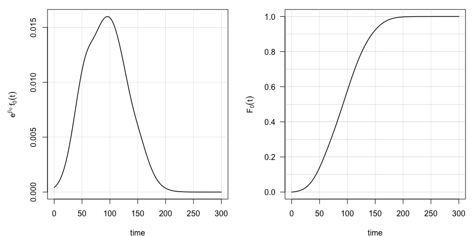 The estimated reference hazard \(\mathrm{e}^{\beta_0}f_0(t)\) and the associated c.d.f. function \(F_0(t)\) governing the baseline dynamics of the cumulative hazard can also visualized,