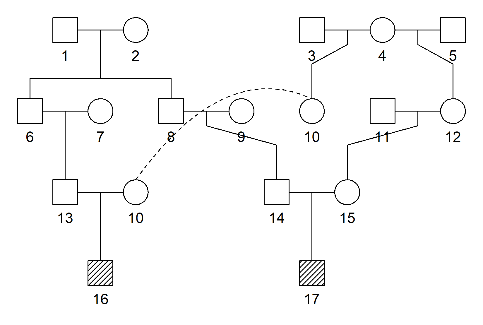 #> 16-13-6-[1,2]-8-14-17This output shows that 16 and 17 are simultaneous first cousins once