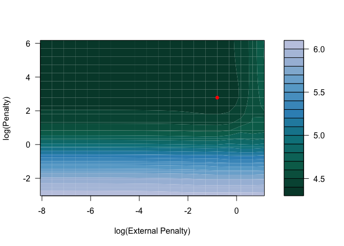 Cross-validation error curves can also be generated with plot by fixing the value of either the penalty on x or the external penalty on external. By default, either penalty defaults the optimal penalty on x or external.