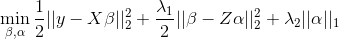 but allows regularization of both the predictors and the external features, where beta is the vector of coefficients describing the association of each predictor with the outcome and alpha is the vector of coefficients describing the association of each external feature with the predictor coefficients, beta. As an example, assume that the outcome is continuous and that we want to apply a ridge penalty to the predictors and lasso penalty to the external features. We minimize the following objective function (ignoring intercept terms):